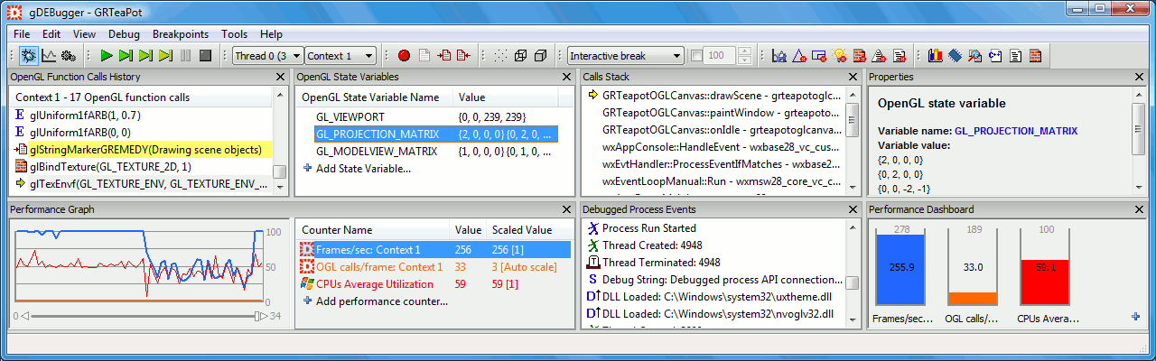 The OpenGL state variables view lets you watch OpenGL state variables values: current material, current projection matrix value, etc. Recently changed state variable values are highlighted in blue.