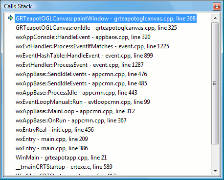 The Call Stack view displays the thread call stack that led to the function call suspending the debugged process run. Double clicking on a list line opens the Source Code Viewer, presenting the appropriate function call source code.