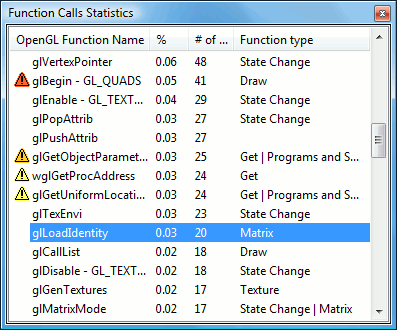 The OpenGL Function Calls Statistics view allows viewing the number of times each OpenGL function call was executed in the previously rendered frame and it's percentage from the total functions execution count. The list is updated each and every time the process is suspended. This invaluable insight information of your application helps you locate (and then remove) redundant OpenGL function calls, state changes, etc.