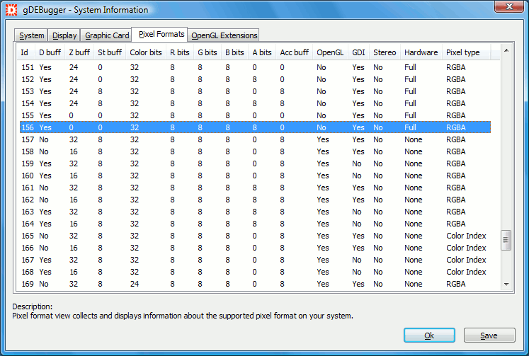 The system information dialog collects computer configuration data and OpenGL implementation details such as: operating system, memory, graphic card and driver details, monitor details, available pixel formats, available OpenGL extensions, etc.