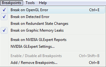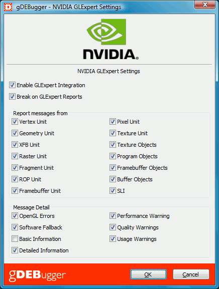 The NVIDIA GLExpert driver integration enables you to receive all GLExpert reports in gDEBugger. It also enables you to break the application run whenever a GLExpert report is triggered by the debugged application and receive the call stack and source code that caused the GLExpert report.