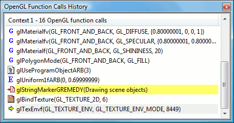 The OpenGL function calls history view displays a log of OpenGL, OpenGL extensions and WGL calls executed in each render context.