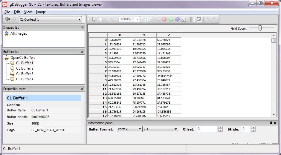 The Buffers and Images viewer allows you to view all buffer and image objects allocated using the OpenCL API. Each object can be viewed both as an image in the image view and as a spreadsheet containing the object raw data in the data view. The object properties and parameters will appear in the properties view.
