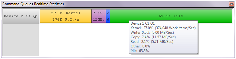 The Command Queues Real Time Statistics view displays, in real time, an overview of OpenCL command queues activities. The displayed information includes: Kernel, Read, Write and Copy Commands Utilization, Work Items processed/Sec, Read, Write and Copy MB/Sec.
