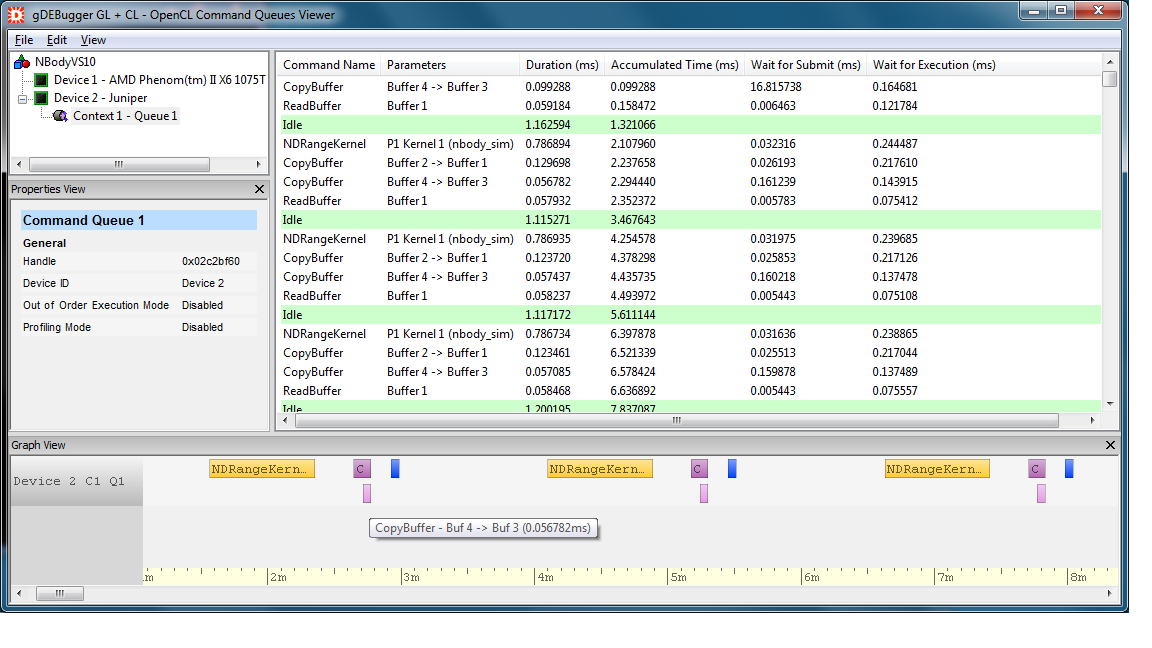 The Command Queues viewer displays a Ganntt chart of OpenCL queued commands timing. The displayed information includes the properties, duration, accumulated time, wait for submit and wait for execution times of each queued command.