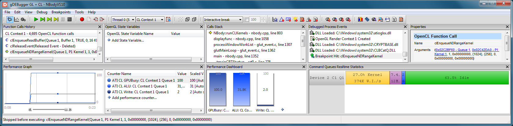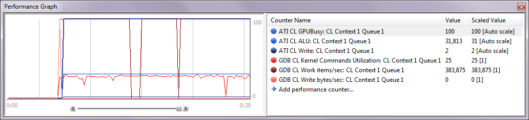 The Performance Graph view displays graphs of performance counters retrieved from various sources: gDEBugger's OpenCL server, operating system and OpenCL ICD vendors. For example: device busy, ALU Busy, average write instructions, L1 cache hit, Queue Idle, Work items/sec, Read bytes/sec, etc...