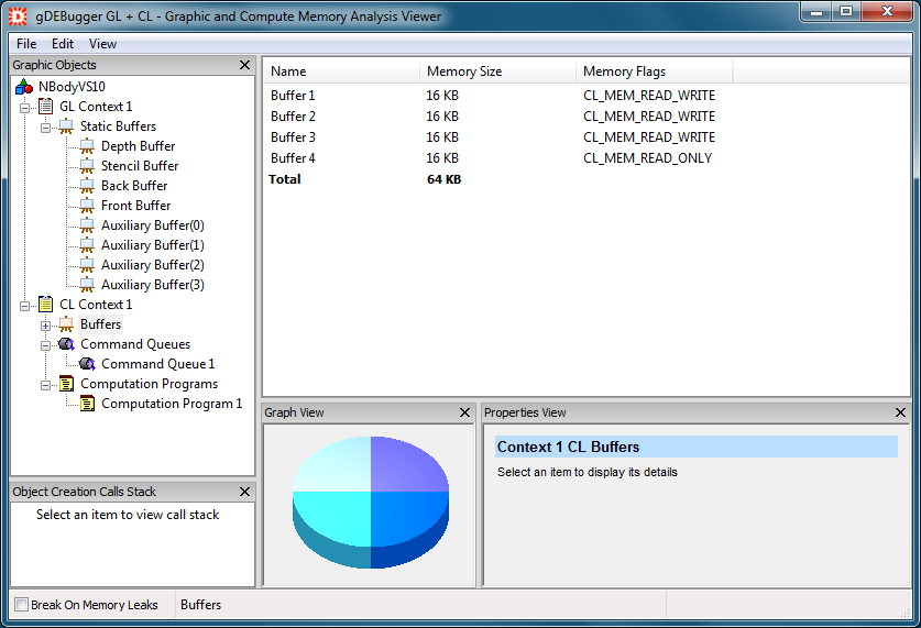 The Memory Analysis viewer displays information about OpenCL memory leaks and OpenCL allocated objects' memory. With the Objects Tree view you can browse the allocated objects quickly by their context and type. The objects' details can be viewed in the Object Details list as well as the Properties view.