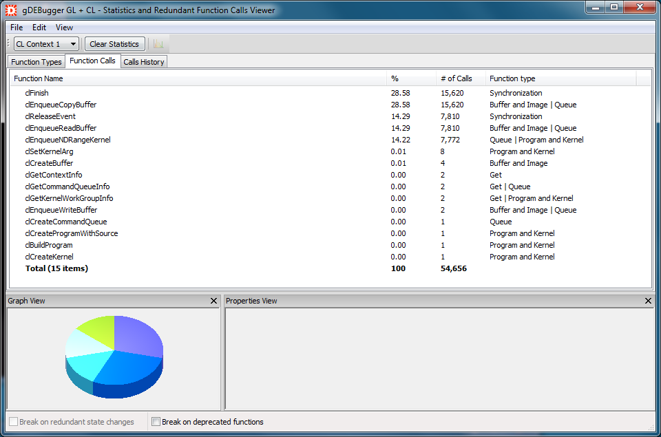 In the Function Types Statistics view, you can view a breakdown of your application's OpenCL usage to categories by functions' effects and actions. Looking at the Function Calls Statistics view, you will be presented with a breakdown of the OpenCL usage on an individual function basis. This viewer also contains the OpenCL Function Calls History view, allowing you to view the actions surrounding each of the unneeded OpenCL function calls.
