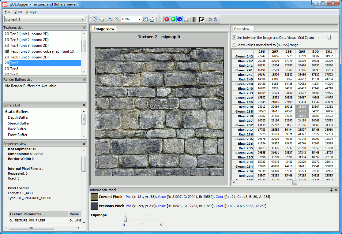 The Textures and Buffers viewer allows you to view all render contexts textures, static buffers and pbuffers (pixel buffers) objects.