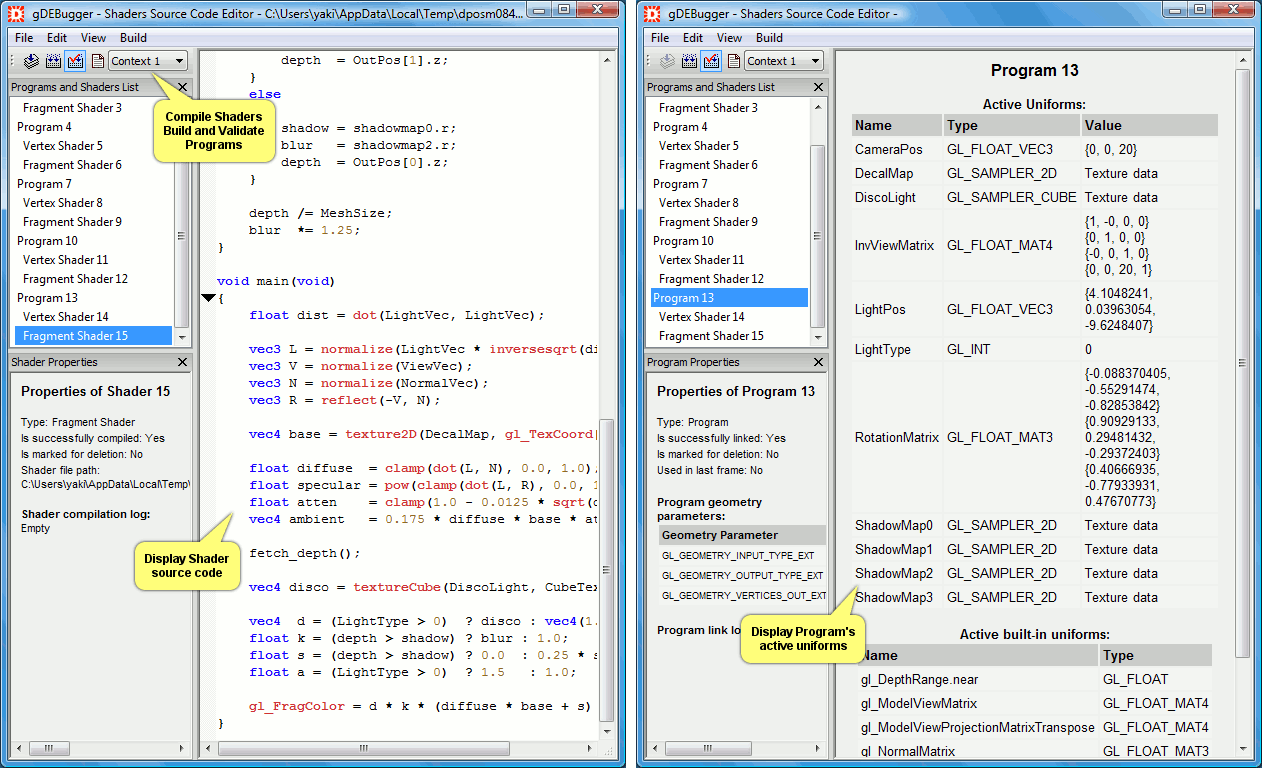 The Shaders Source Code editor displays a list of shading programs and shaders that exist in each render context, enabling you to edit shaders source code, recompile shaders, link and validate programs "on the fly". The editor views displays each shader's source code and parameters. Also displayed are program's attached shaders, active uniforms and parameters.