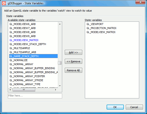 The State Variables dialog lets you choose OpenGL, WGL and OpenGL extension state variables. When the debugged process execution is suspended you will be able to see the selected state variables values in the State Variables view.