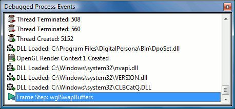 The process events view displays events that occur during the debugged process execution: Process Created, Process Run Started, DLL Loaded, DLL Unloaded, OpenGL Error, Second Chance Exception, Breakpoint Hit, Output Debug String, etc.