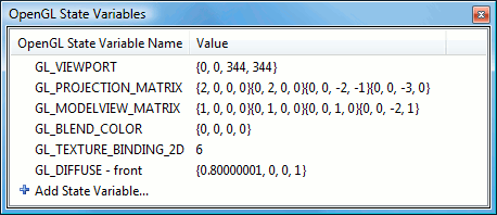 The OpenGL state variables view lets you watch OpenGL state variables values: current material, current projection matrix value, etc. Recently changed state variable values are highlighted in blue.