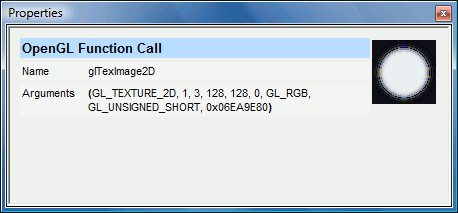 The properties view displays detailed information about items appearing in gDEBugger views. Example: Clicking on a logged OpenGL function call in the "OpenGL functions calls history" view will display the function name, its arguments and its associated texture image. Clicking on the texture image will open the Texture Viewer displaying the texture details.