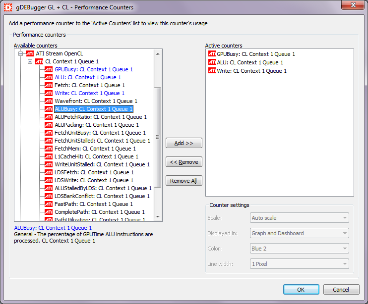 The Performance Graph view displays graphs of performance counters retrieved from various sources: gDEBugger's OpenCL server, operating system and OpenCL ICD vendors. For example: device busy, ALU Busy, average write instructions, L1 cache hit, Queue Idle, Work items/sec, Read bytes/sec, etc...