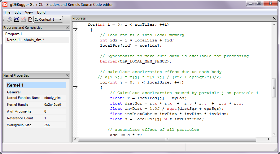 The Kernels Source Code editor displays a list of OpenCL programs and kernels that exist in each OpenCL context, enabling you to edit program's source code and recompile programs "on the fly". The editor views displays each program's and kernel's source code and parameters.